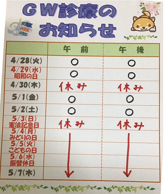 誠に勝手ながら5月のゴールデンウィークは下記の日程を休診とさせていただきます。ご迷惑をおかけいたしますが、何卒ご理解いただきますようよろしくお願いいたします。※フード等のご注文はお早めにご連絡ください。